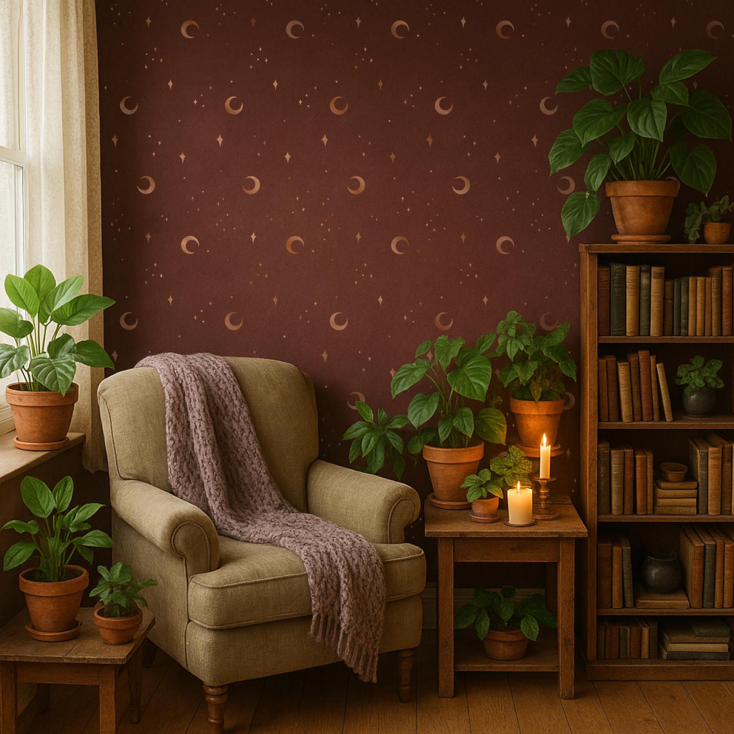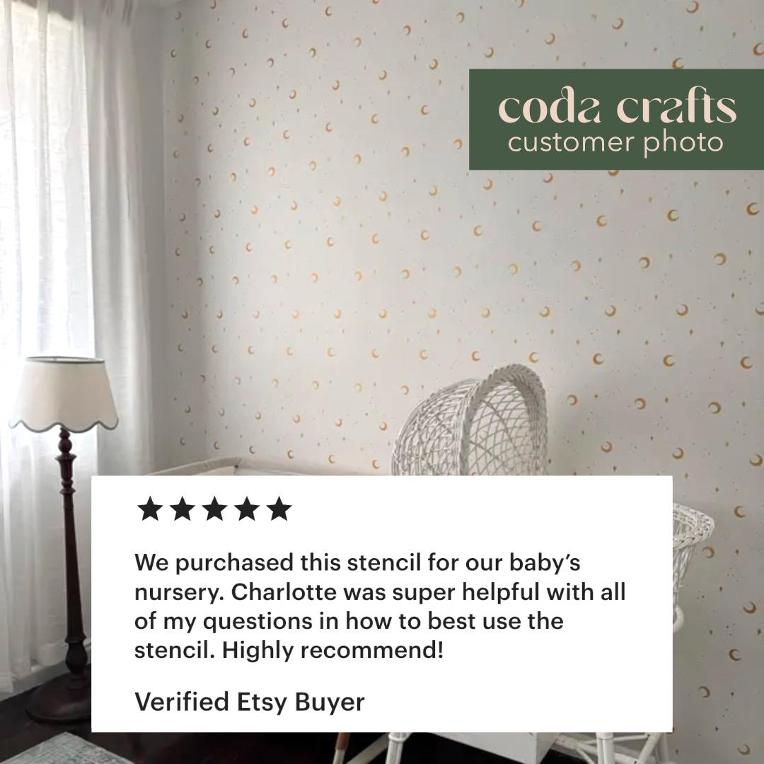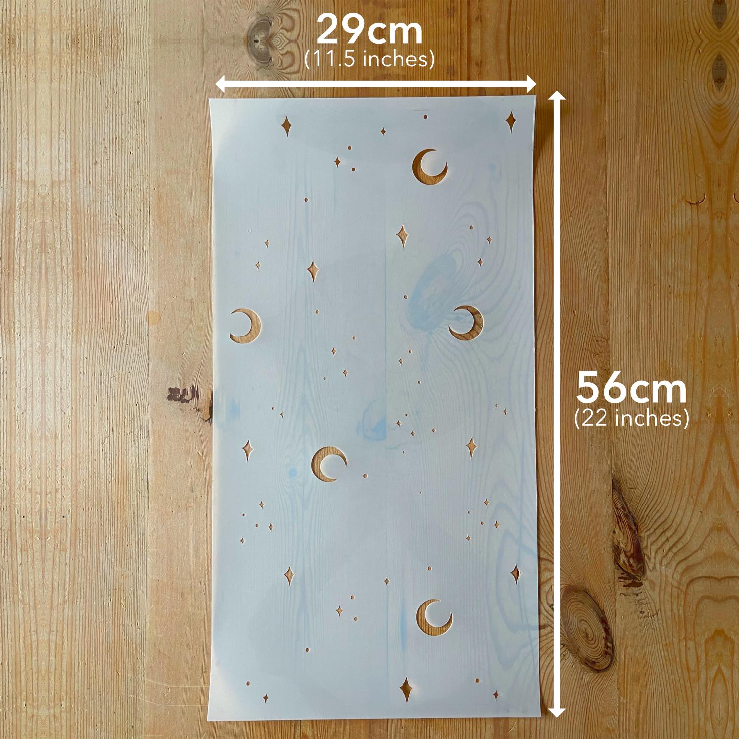 The Celestial stencil features hand-drawn whimsical moons and stars, perfect for a nursery feature wall, ceiling, or witchy upcycling of your bedroom furniture.