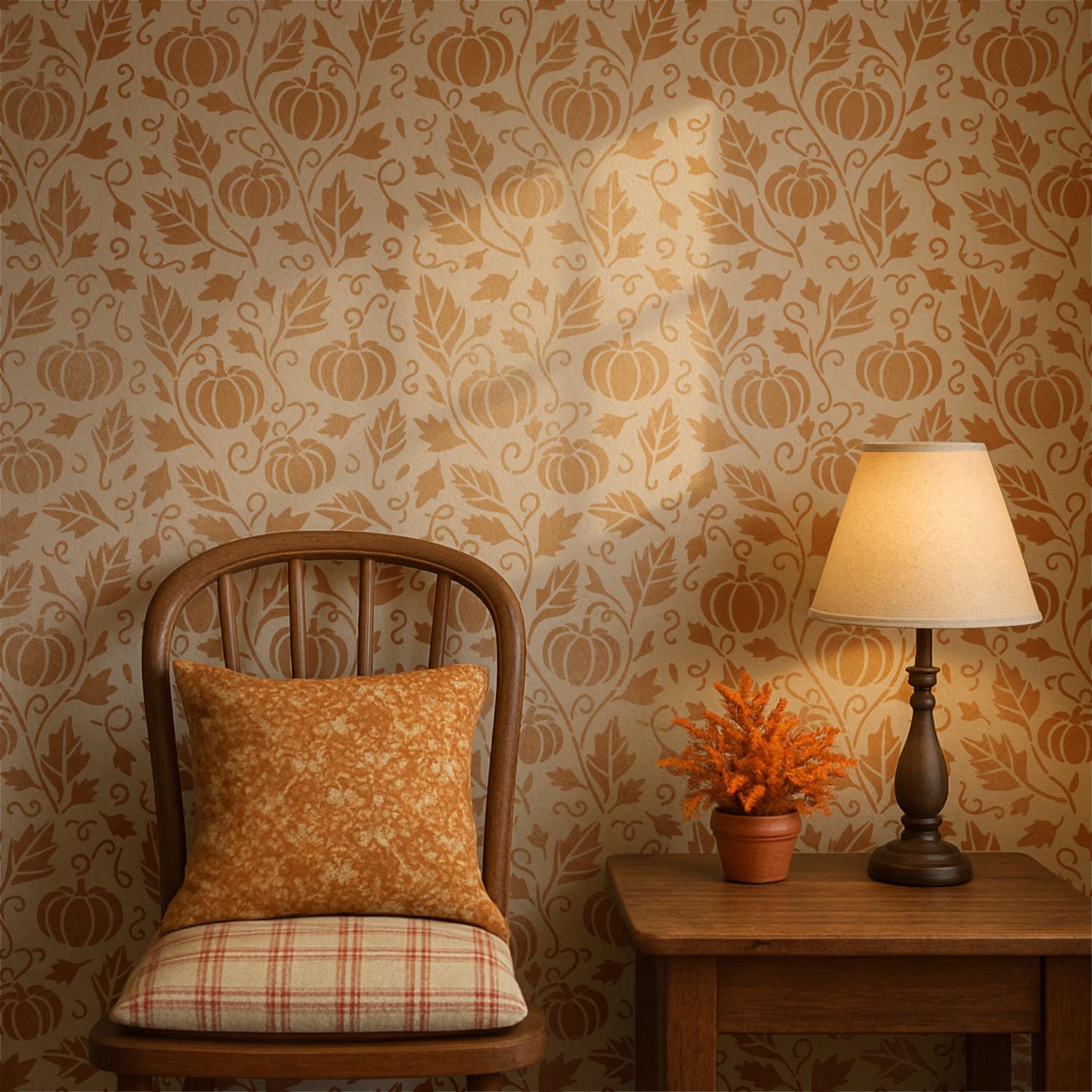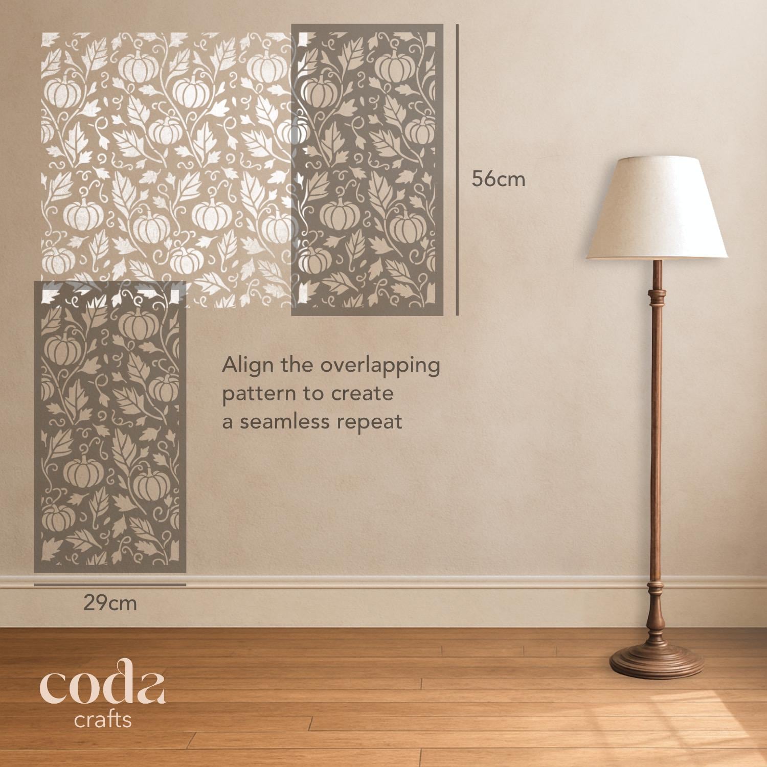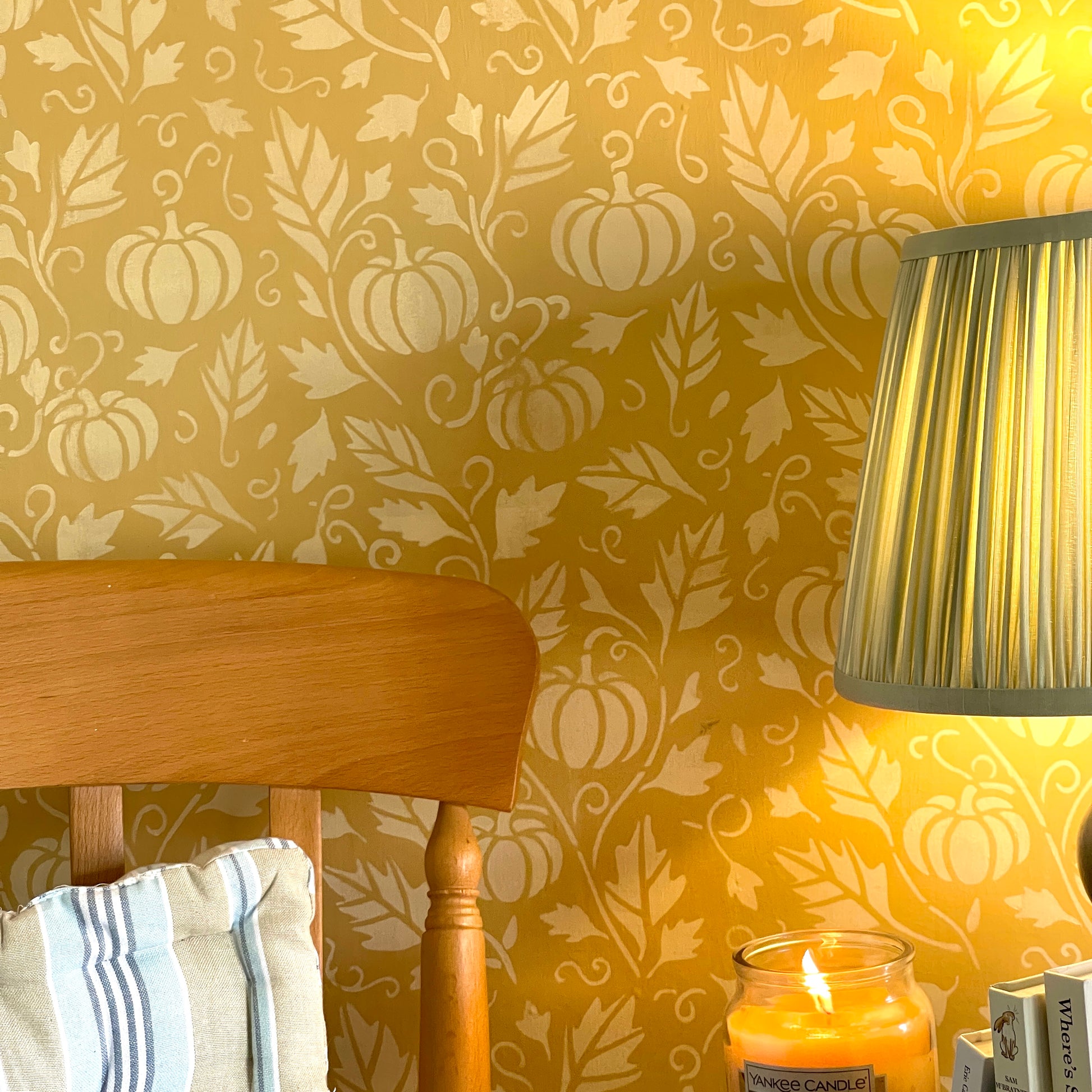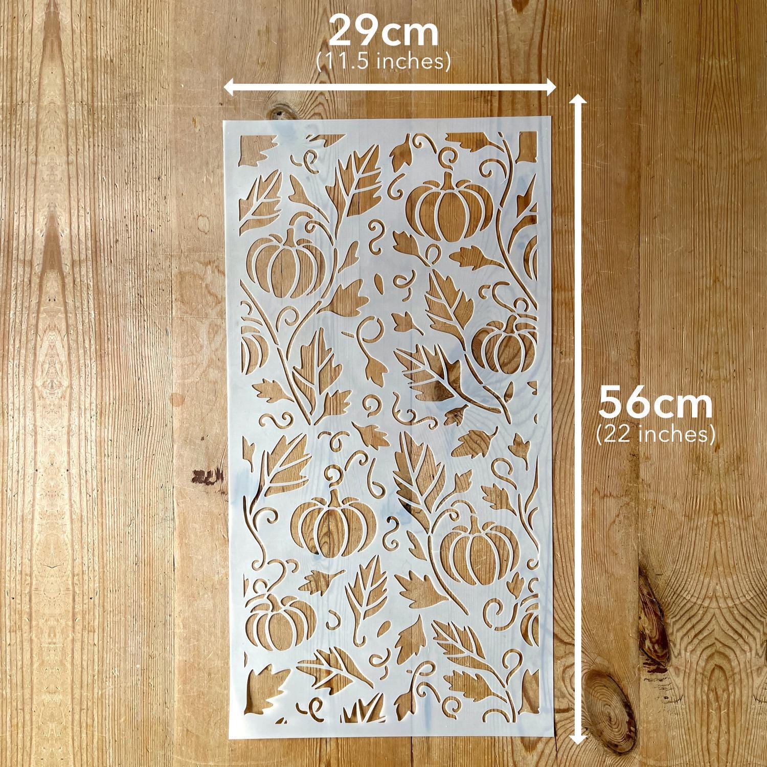 The Pumpkin Patch stencil features hand-drawn pumpkins, leaves & vines, perfect for that cosy autumnal decor in your farmhouse kitchen, pantry or little one’s nursery.