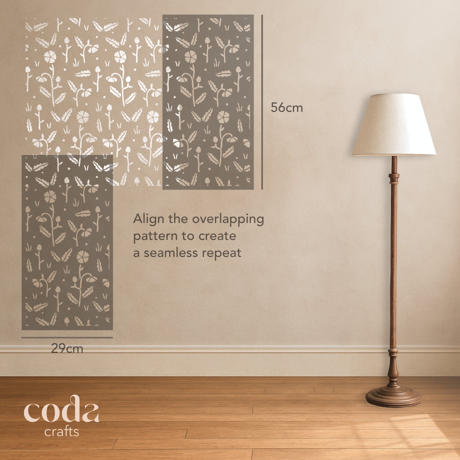 The Wildflower Poppy stencil features whimsical hand-drawn poppies and leaves, perfect for your folk art projects and cottagecore decor.
