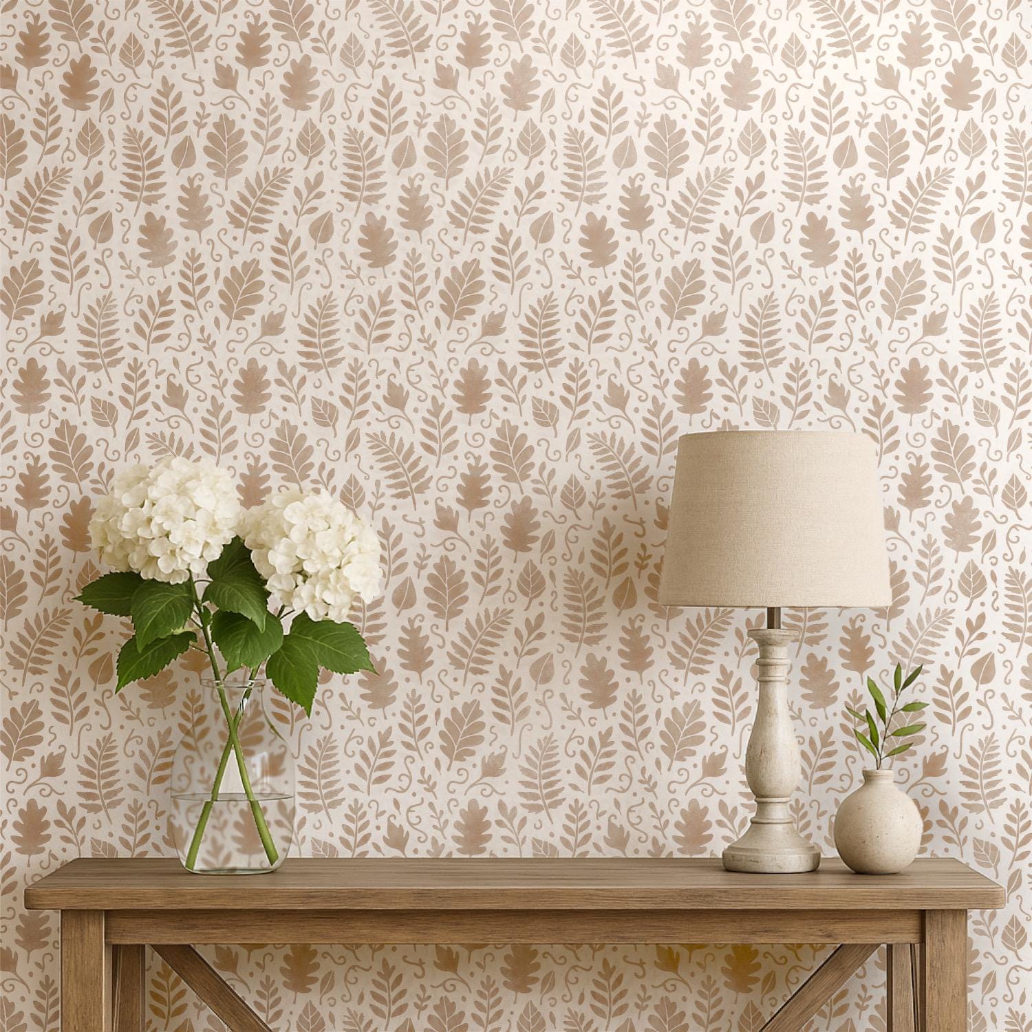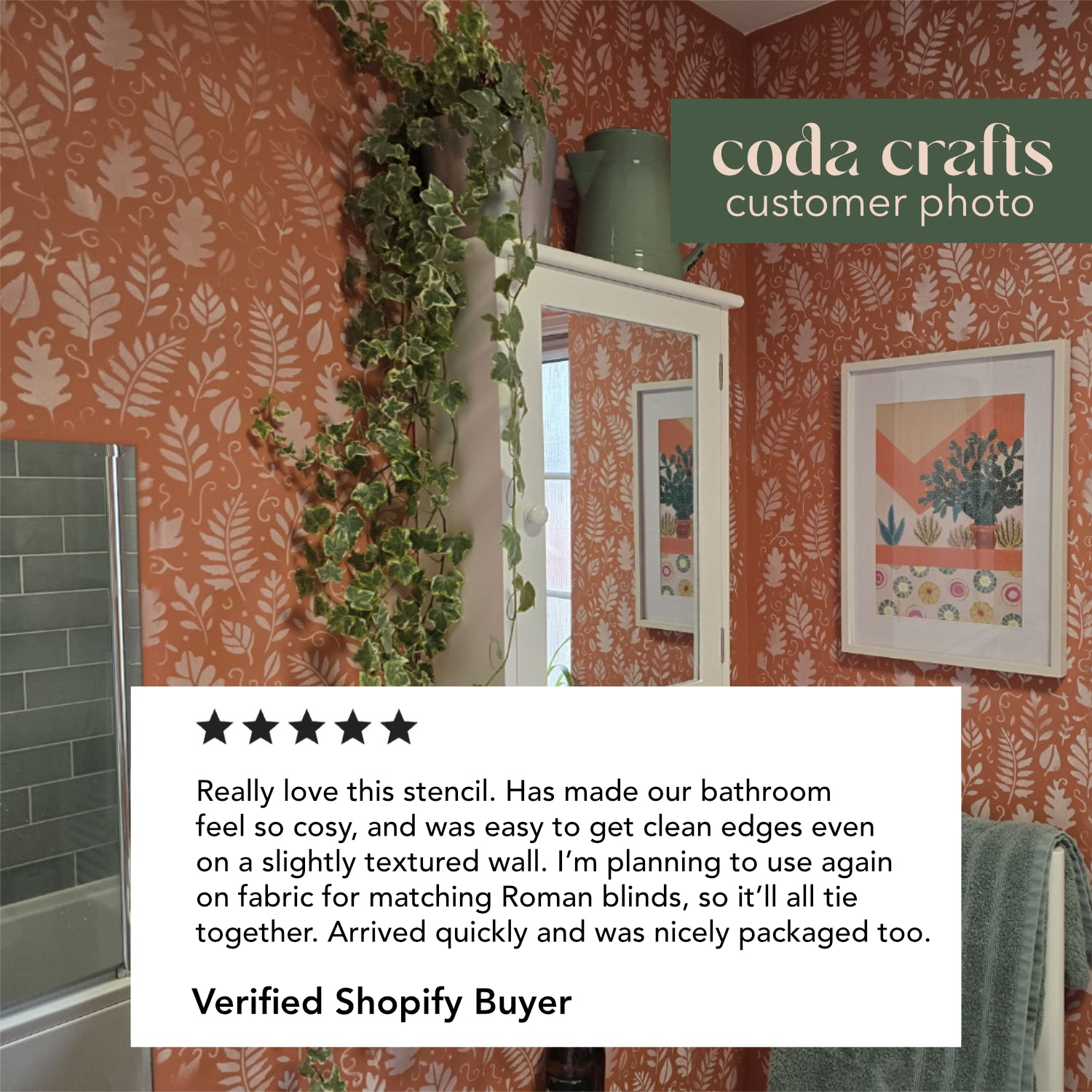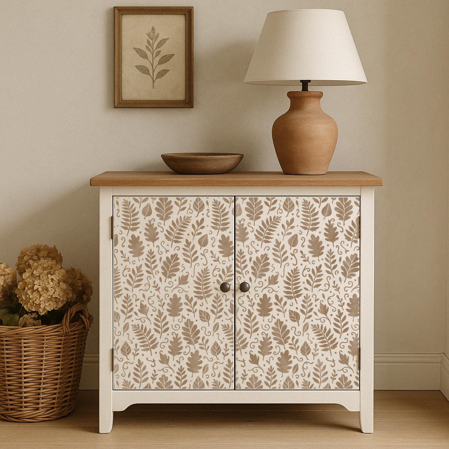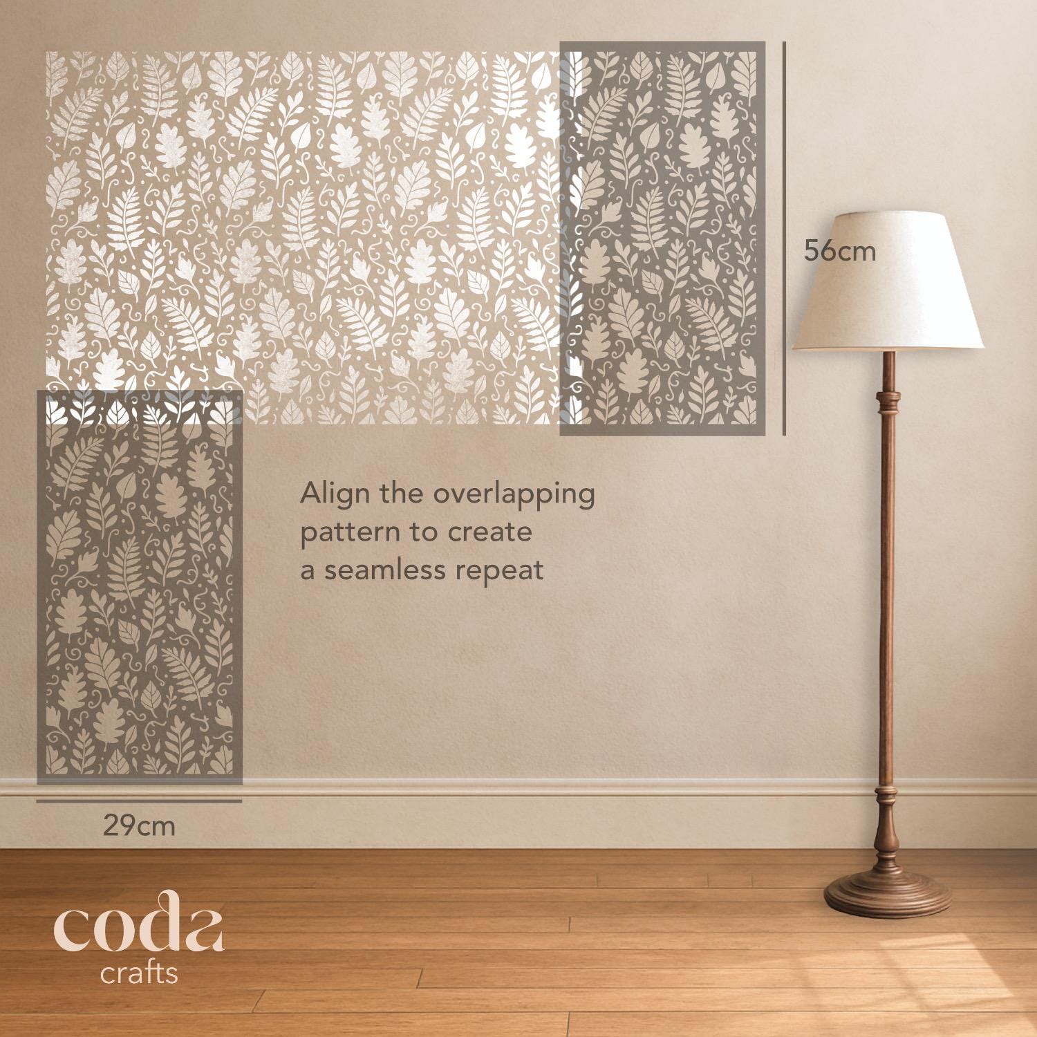 The Woodland Leaf stencil features intricate hand-drawn leaves with a whimsical fantasy touch, ideal for nature aesthetics, a woodland nursery or cosy seasonal decor.